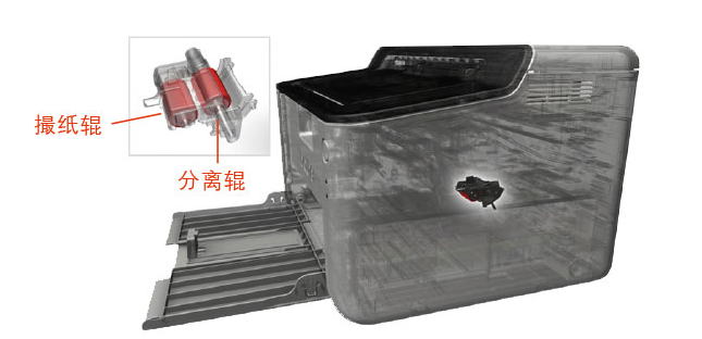 采用在機身內(nèi)置兩個輥軸,分別為撮紙輥和分離輥,讓紙張在走紙的過程中,大大降低由于多頁進紙而造成的卡紙的機率。