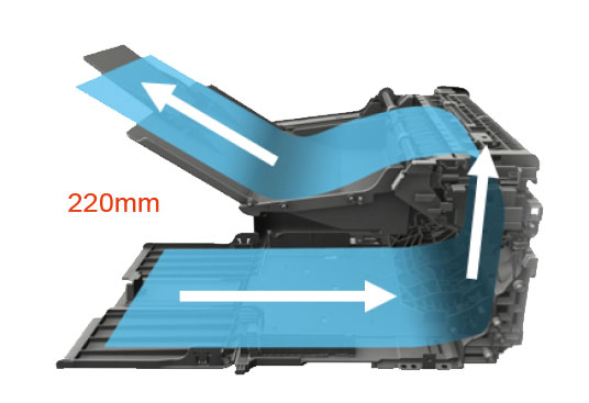 紙張的走紙通道從通常的450mm縮短至220mm,使打印更順暢、更快捷。