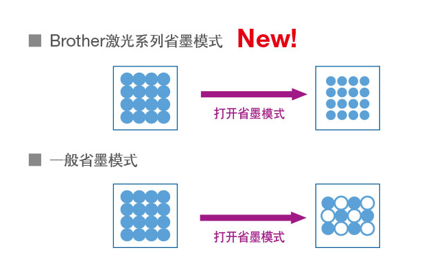 對于日常文檔處理,您也可以通過Brother省墨模式可以節(jié)省墨粉消耗。Brother省墨是通過縮小墨點(diǎn)空間來完成,墨點(diǎn)數(shù)量沒有改變,即使采用省墨模式也不會影響打印質(zhì)量。